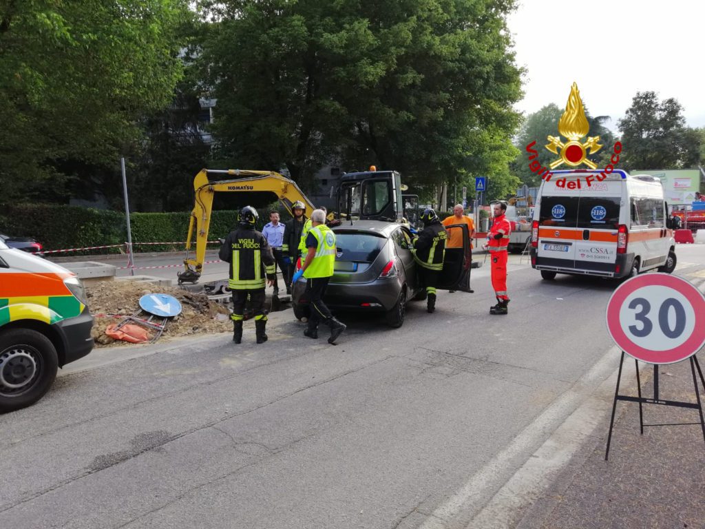 Alle 7.45, i vigili del fuoco in zona villaggio del Sole a Vicenza per soccorrere un operario investito da un’auto rimasto incastrato in un pozzetto del cantiere della nuova rotatoria.