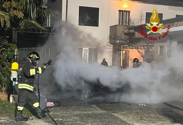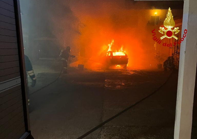 Il proprietario, mentre l’auto era in garage, si è accorto che qualcosa non andava ed è riuscito a portare fuori l’auto, che ha subito preso fuoco.
