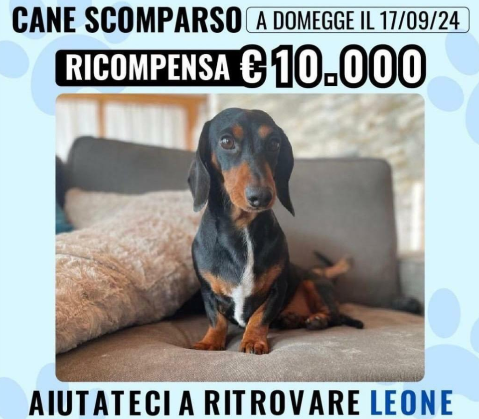 DOMEGGE (BELLUNO) - AGGIORNAMENTO 22 SETTEMBRE 2024: LEONE È STATO RITROVATO, QUI LA NOTIZIA Una sostanziosa cifra è stata messa in palio da Martina per chi riuscirà a ritrovare il suo adorato bassott...