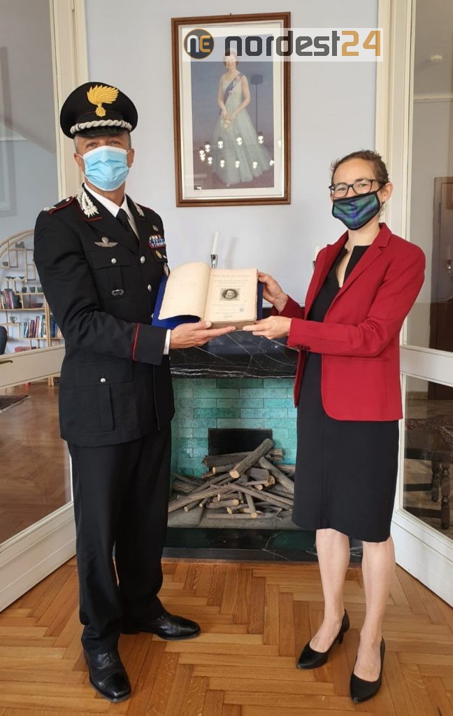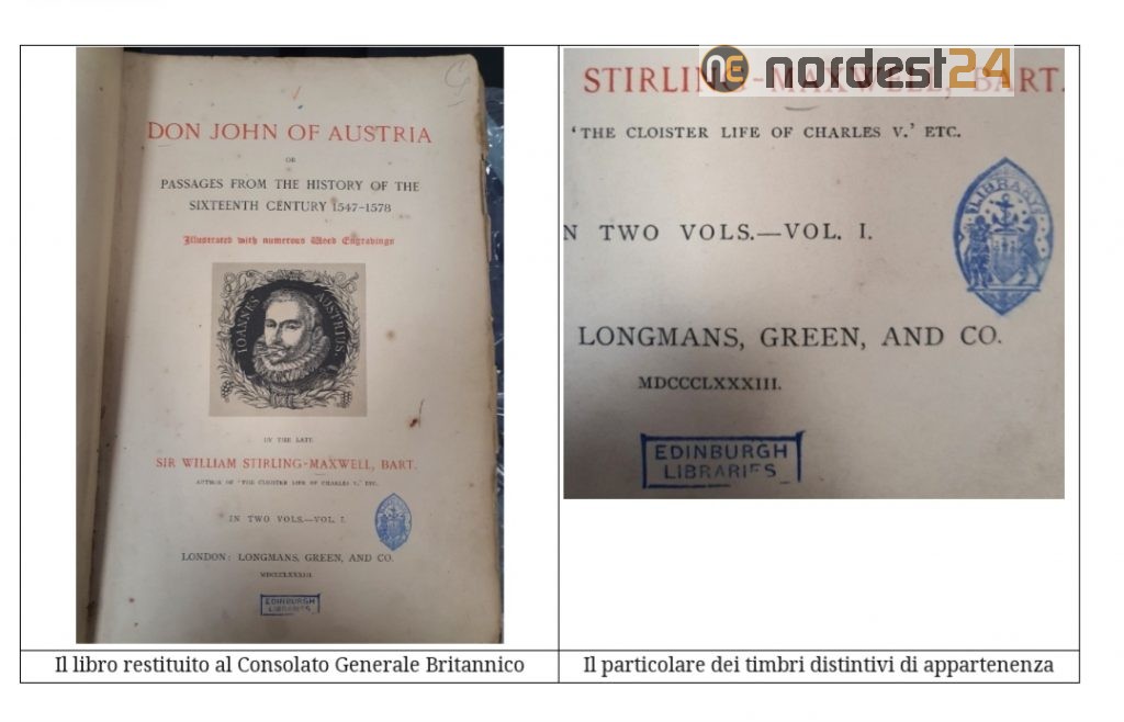 Il volume “Don John of Austria, vol. 1” di Sir William Stirling-Maxwell, edito a Londra nel 1883, è stato restituito alla dott.ssa Catriona Graham, Console Generale Britannico a Milano, dal Comandante del Nucleo per la Tutela del Patrimonio Culturale di Udine, Magg. Lorenzo Pella, al termine di un’indagine coordinata dalla Procura della Repubblica di Pordenone, inquadrata nell’ambito dell’operazione internazionale denominata “Pandora V” sotto l’egida di Interpol ed Europol.