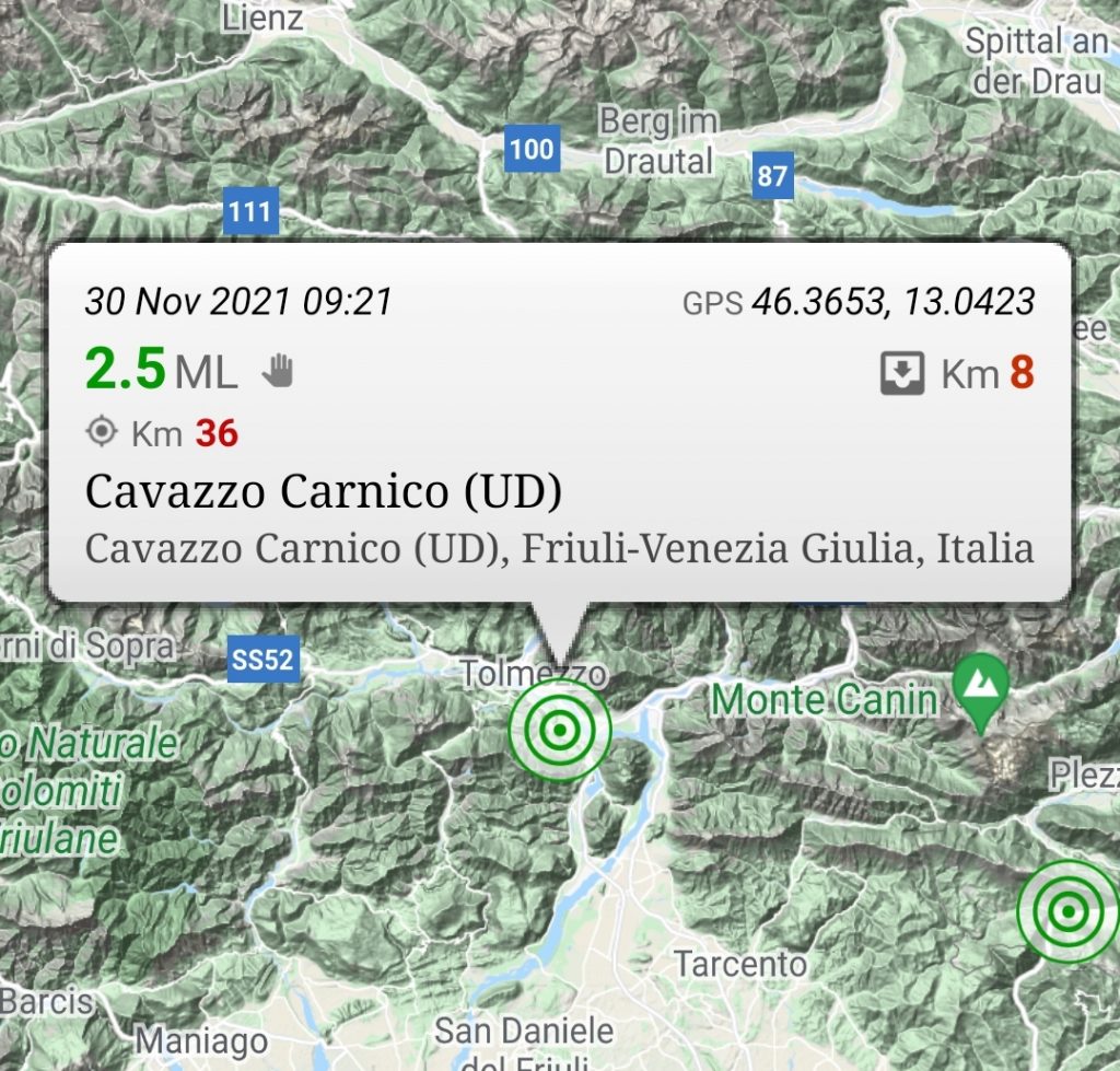 Un terremoto di magnitudo ML 2.5 è avvenuto nella zona: Cavazzo Carnico (UD), oggi 30-11-2021 alle ore 09:21 con coordinate geografiche (lat, lon) 46.365, 13.042 ad una profondità di 8 km.