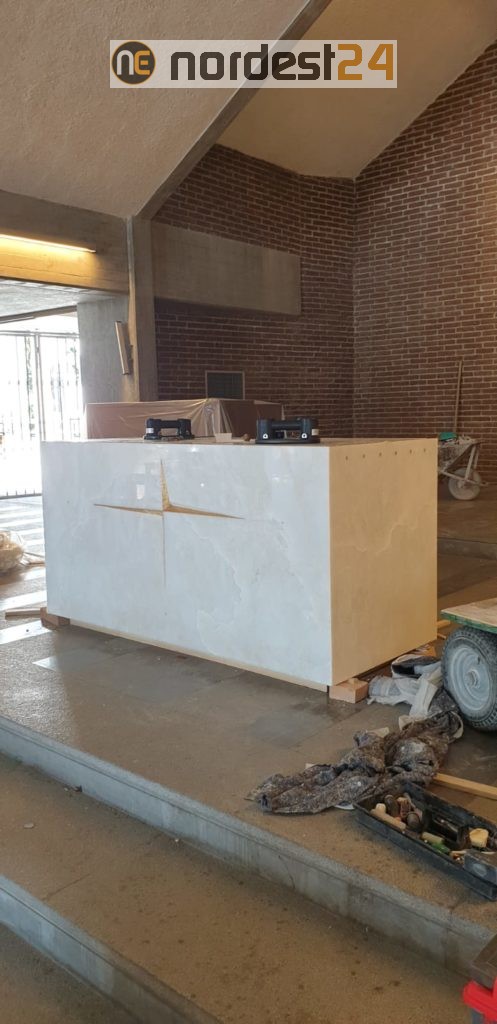 E uno di questi è proprio l’altare della chiesa di Pineta, in marmo Namibia Rhino White, dal colore bianco cristallino puro, un marmo che sin dall’antichità viene impiegato nell’architettura, dotato di una struttura molto cristallina, che lo rende particolarmente resistente.