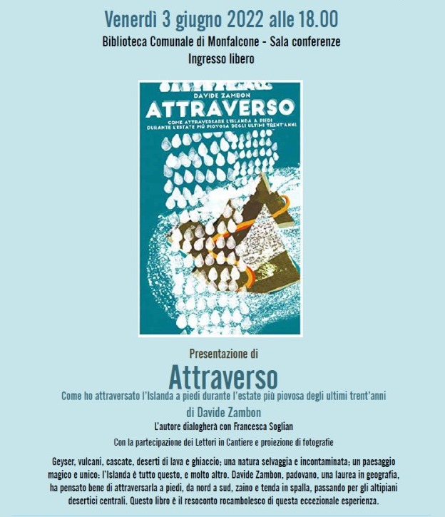 Venerdì 3 giugno 2022 alle 18.00, presso la Sala conferenze della Biblioteca Comunale di Monfalcone, Davide Zambon presenta il suo libro Attraverso. Come ho attraversato l’Islanda a piedi durante l’estate più piovosa degli ultimi trent’anni.