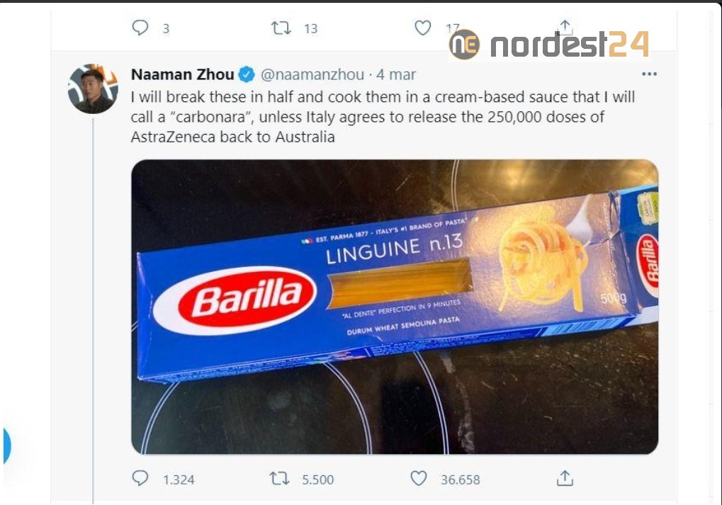 L'Italia blocca 250mila dosi di vaccini AstraZeneca diretti in Australia e gli australiani "boicottano" la pasta. Su Twitter scoppia la "vendetta pacifica", che ha già fatto il giro dei social, con le...