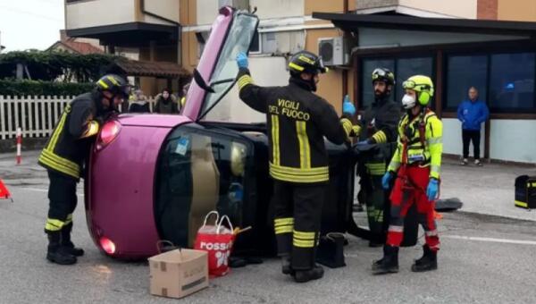 Con la minicar urta un'auto in sosta e si ribalta: ferito