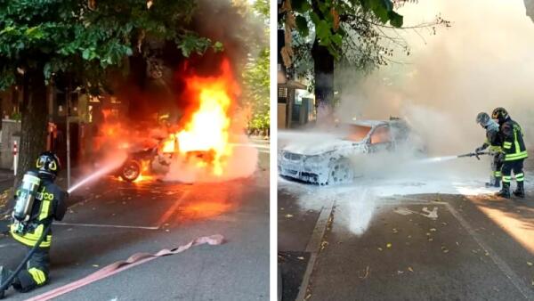 La Bmw 320 s'incendia all'improvviso: auto distrutta, conducente in salvo