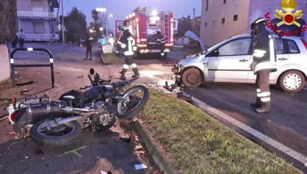 Pauroso scontro all'alba a Paese tra moto ed auto: due feriti gravi