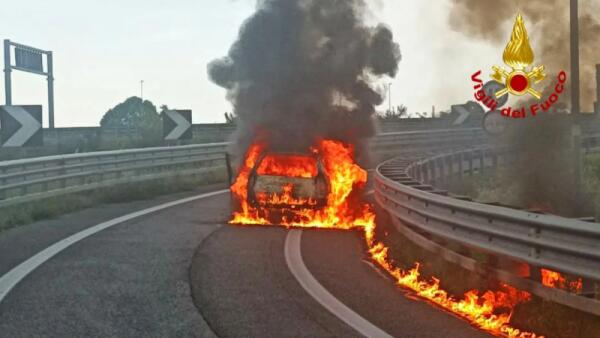 Incendio lungo l'autostrada A27, auto distrutta dalle fiamme
