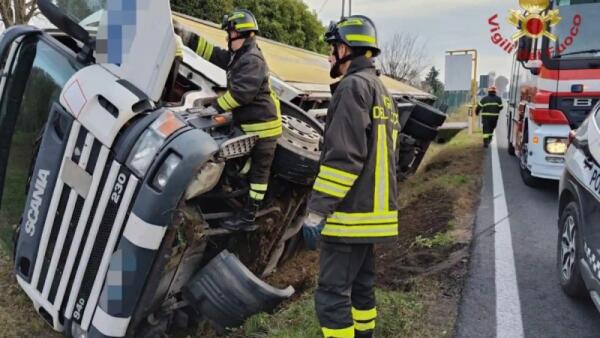 Mezzo pesante esce di strada e si rovescia nel fossato: lievi ferite per il conducente