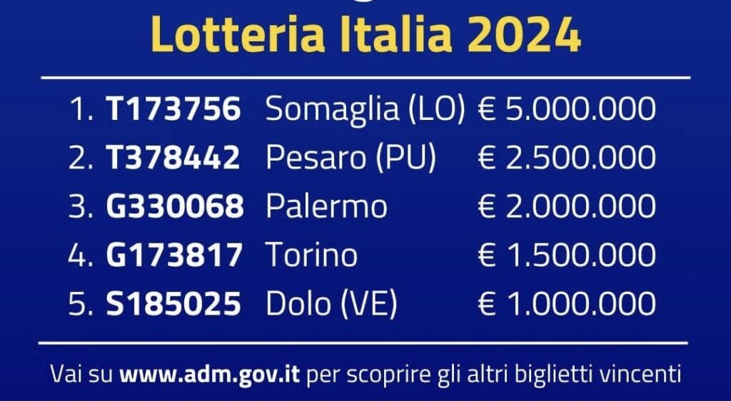 Il secondo ticket da 2,5 milioni è stato invece acquistato a Pesaro presso la tabaccheria di Marcello Bucci in Piazza Giovanni Lazzarini, 8, mentre il tagliando vincitore del terzo premio da 2 milioni va alla pasticceria Porretto di Palermo in via Luigi Galvani, 49.