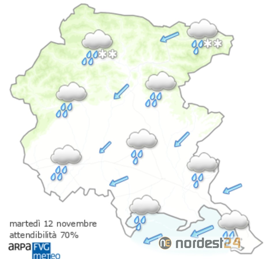 Cielo coperto con precipitazioni in genere moderate durante la giornata, verso sera piogge da abbondanti ad intense; la quota neve al mattino sarà in genere oltre i 1800 m circa sulle Prealpi e 1500 m sulle Alpi con oscillazioni, ma in serata sulle Alpi potrà scendere fino a 1000-1200 m circa.