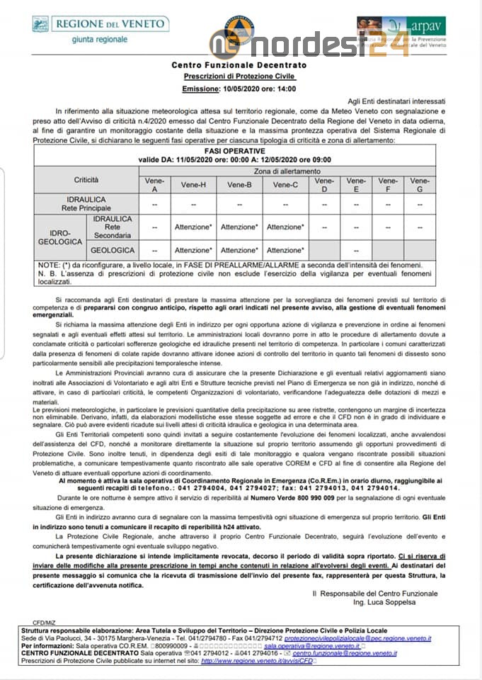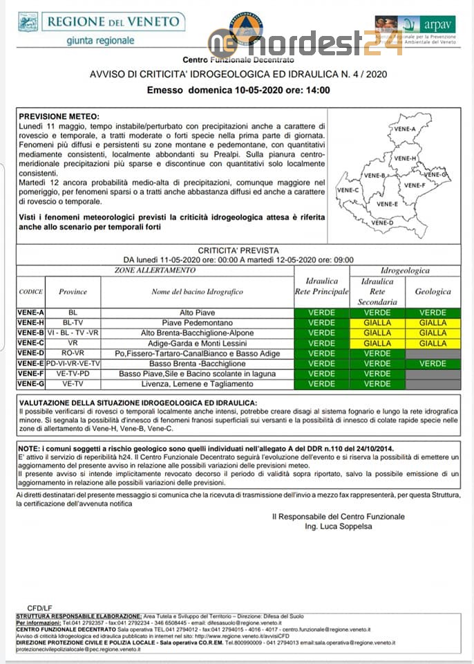 Allerta per criticità idraulica nella giornata di domani lunedì 11 maggio tra Veneto e Friuli Venezia Giulia. Lunedì tempo instabile/perturbato con precipitazioni anche a carattere di rovescio e temp...
