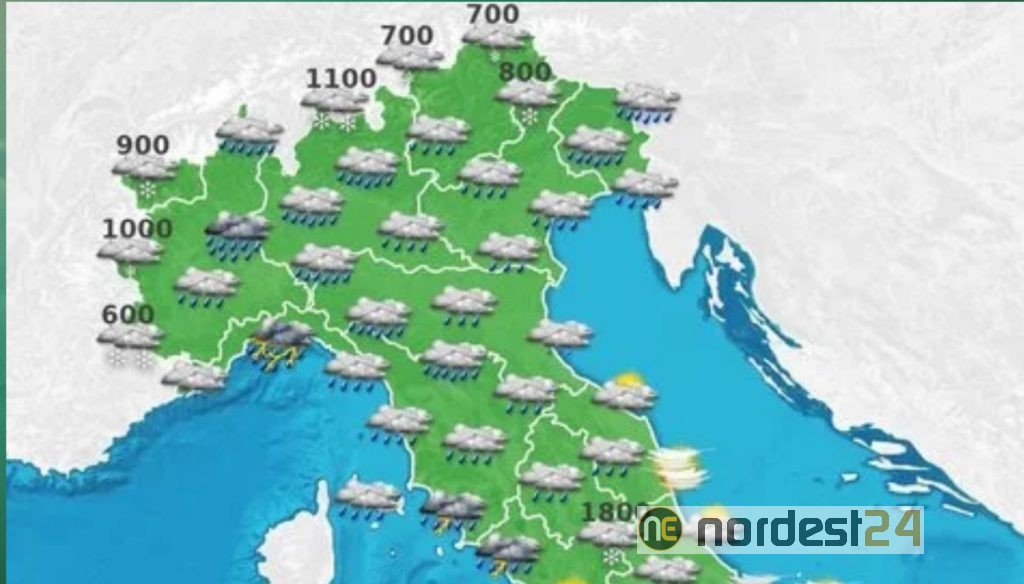Cielo coperto con piogge intense ad ovest, abbbondanti ad est, anche temporalesche, meno probabili a Trieste. Nevicate abbondanti oltre i 1700 sulle Prealpi, 1400 sulle Alpi con oscillazioni. Sulla costa soffierà vento da est o sud-est moderato. In serata attenuazione delle precipitazioni.