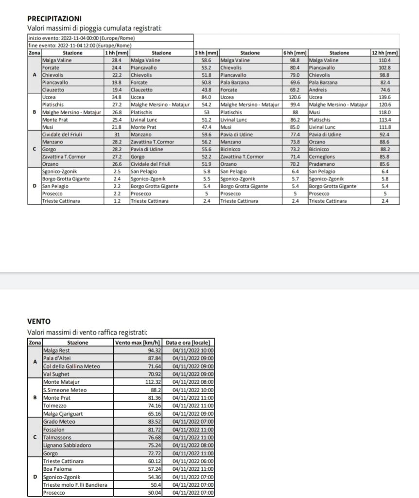 SITUAZIONEDall'inizio dell'episodio sono stati registrati cumulati di pioggia fra 100 e 180 mm sulle Prealpi Giulie (con il massimo a Uccea), fra 60 e 130 mm sulle Prealpi Carniche, fra 20 e 70 mm sul...