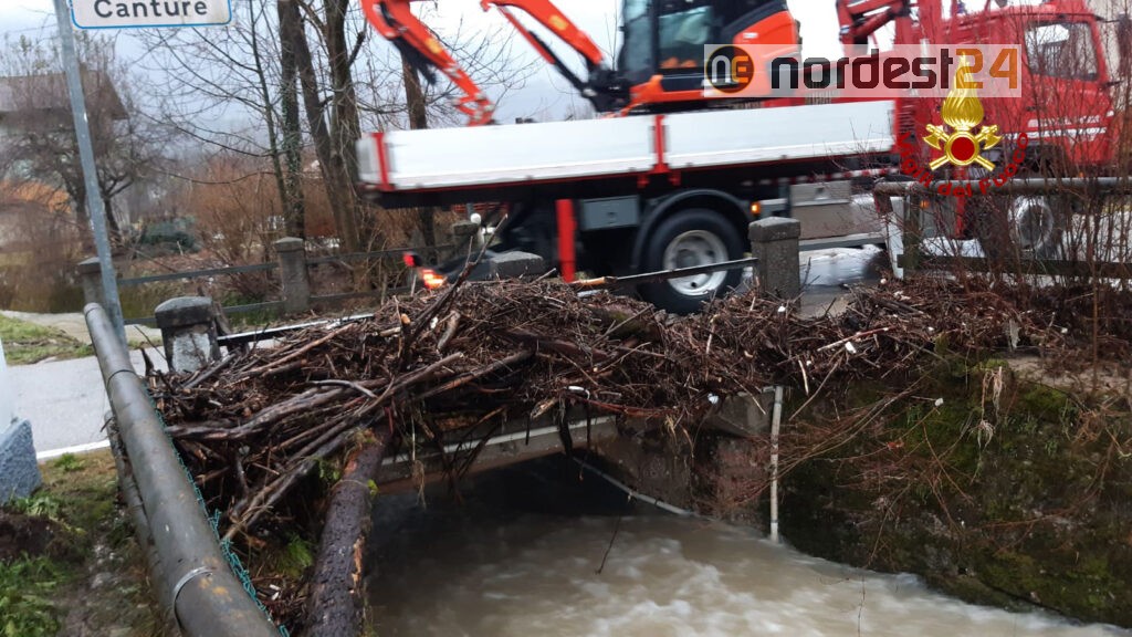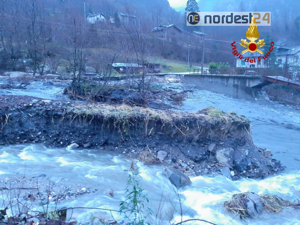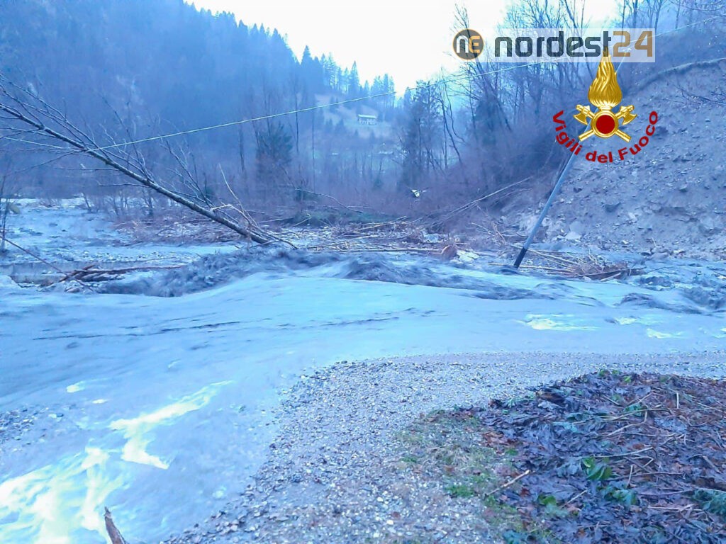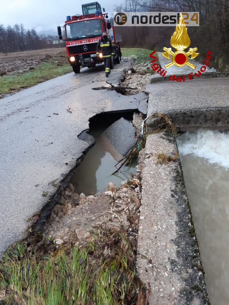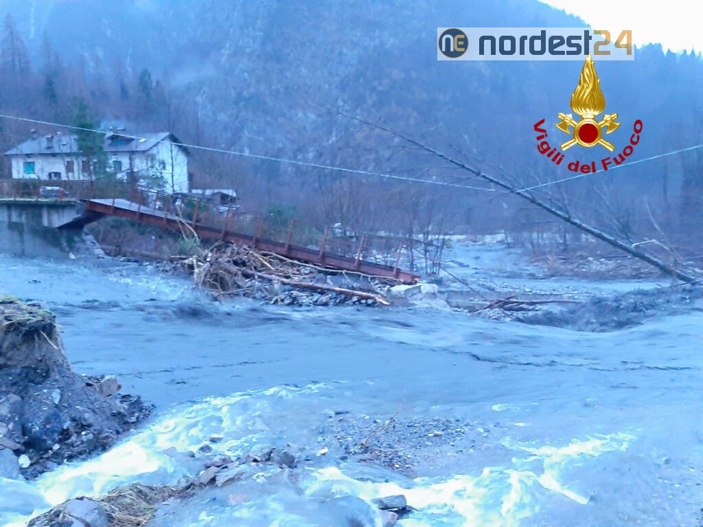 Situazione critica per allagamenti anche nel feltrino. Un mezzo polivalente dei vigili del fuoco ieri sera è precipitato per il crollo di un di un ponte in località Ren. Il personale è riuscito a mettersi in salvo prima del cedimento.