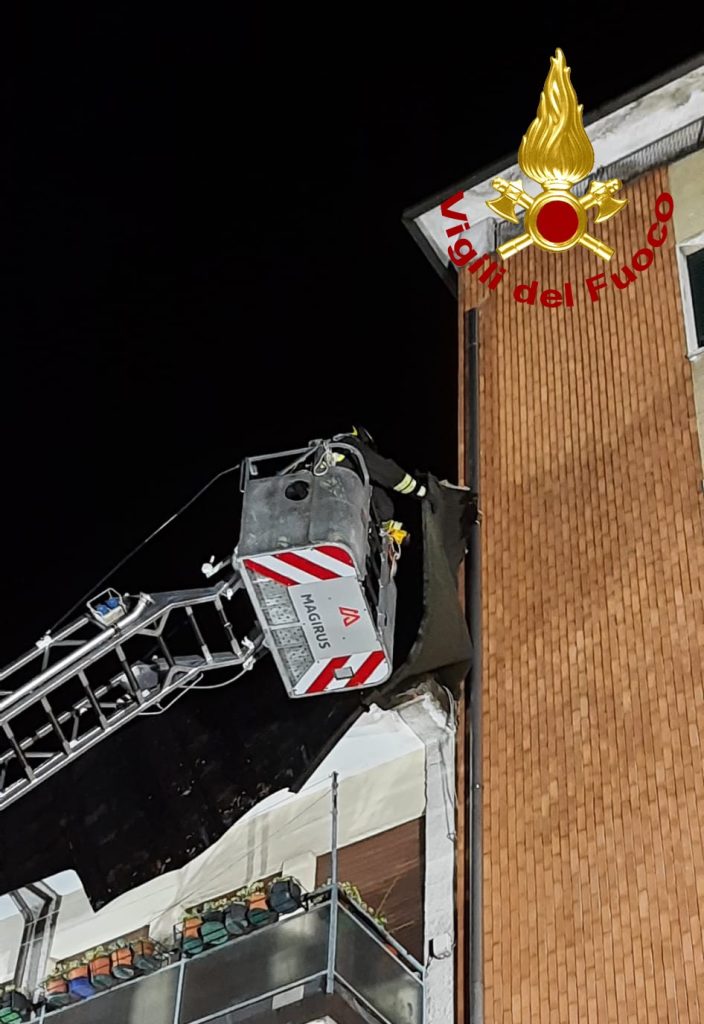 Sono stati oltre una decina gli interventi dei vigili del fuoco per il forte temporale che nella tarda serata di martedì ha interessato il vicentino particolarmente la zona ovest della provincia dove il tetto di un condominio è stato scoperchiato per il vento. A Montecchio Maggiore, intervento di diverse squadre dei vigili del fuoco per mettere in sicurezza il tetto di un condominio di sei unità abitative andato scoperchiato dalla guaina con il distacco della grondaia e il danneggiamento dei comignoli e delle antenne. I vigili del fuoco hanno lavorato per oltre 4 ore con il personale SAF (speleo alpino fluviale) e l’autoscala per coprire con dei nylon il tetto.