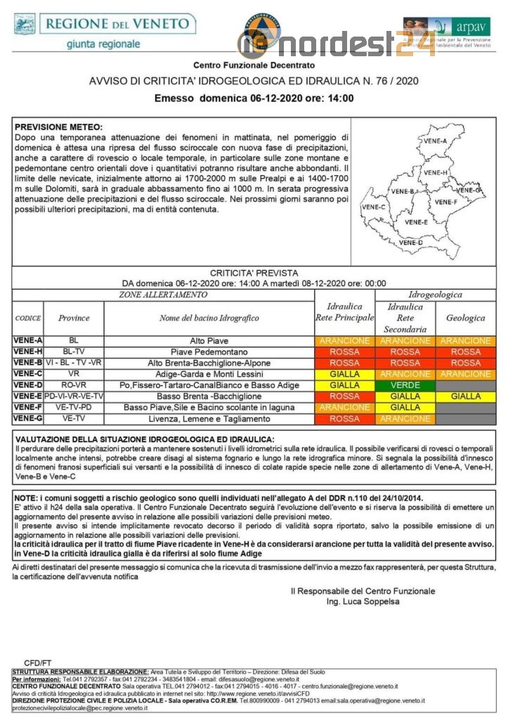 ⚠️ È stato dichiarato lo stato di preallarme (allerta arancione) per criticità idraulica e idrogeologica per i bacini dell’ Alto Piave e Basso Piave – Sile; per criticità idrogeologica per l’Adige-Garda. Allerta gialla (stato di attenzione) per criticità idraulica per il Po.
