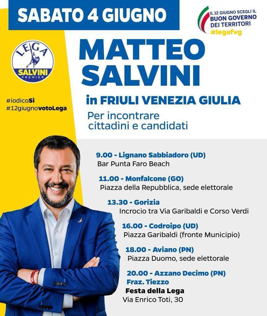 Matteo Salvini in Friuli Venezia Giulia sabato 4 giugno: programma