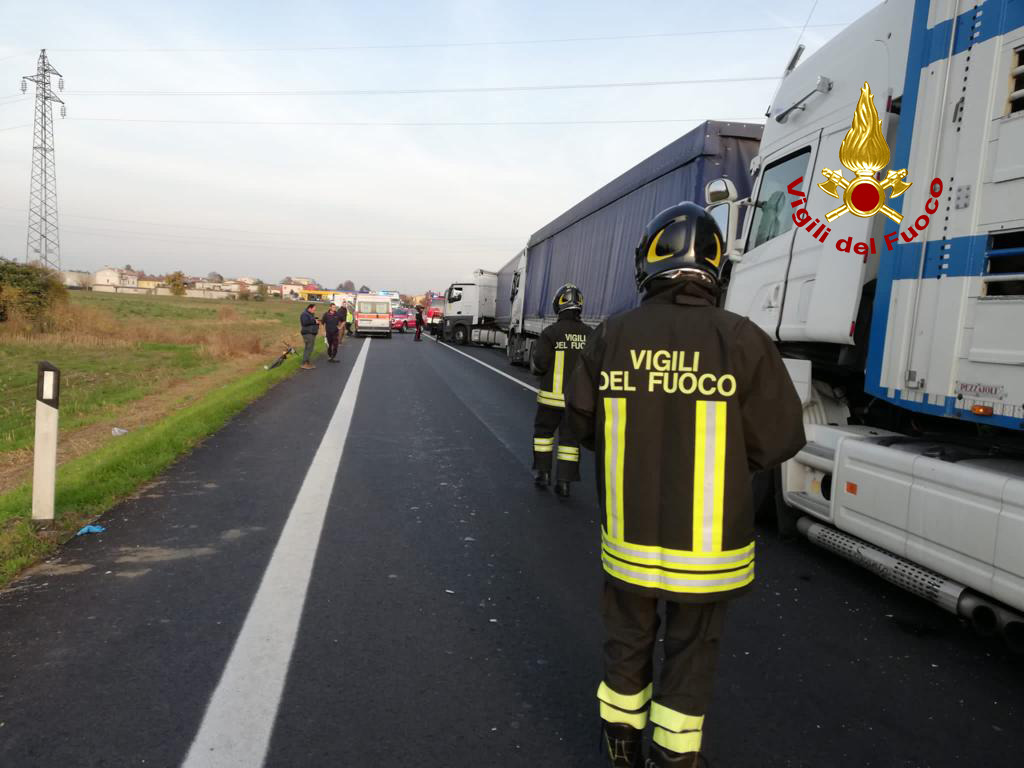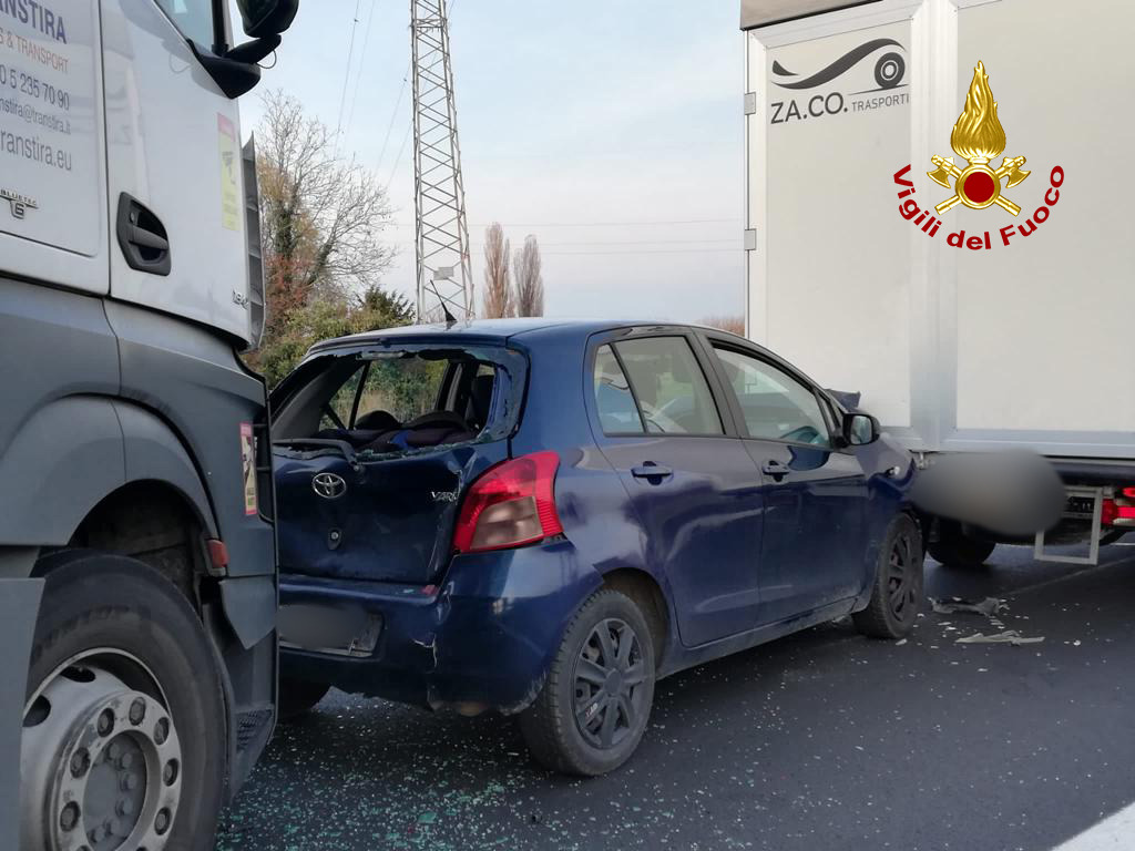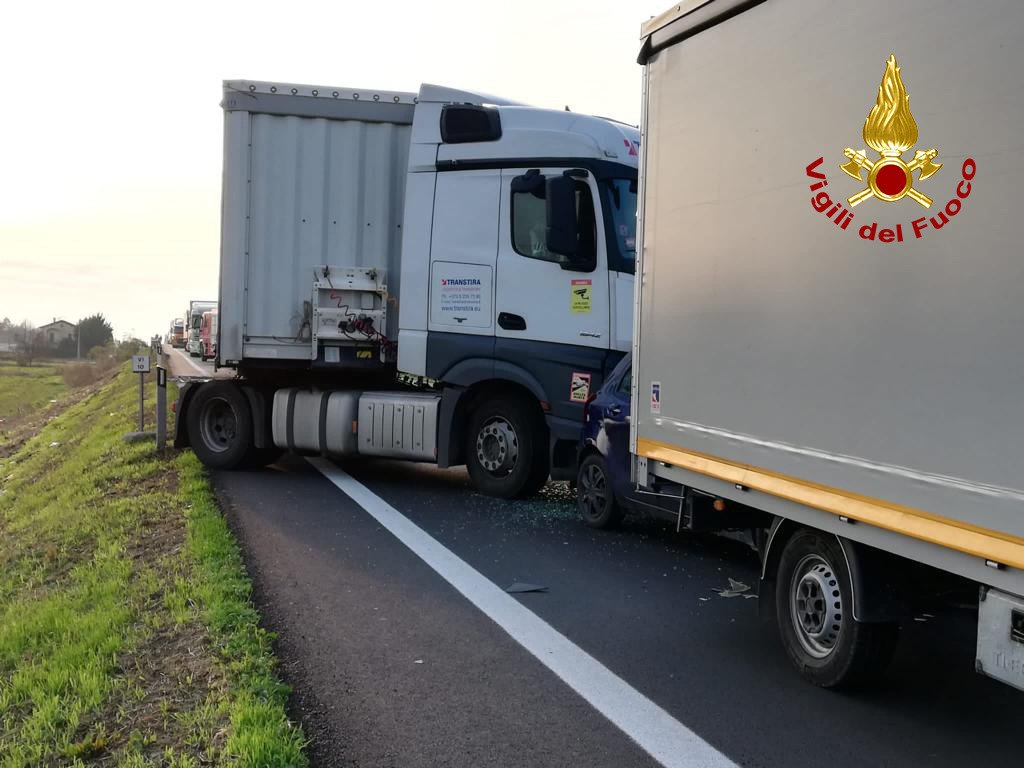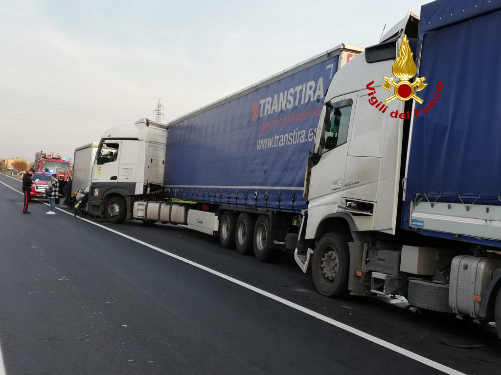 Maxi tamponamento tra 3 mezzi pesanti, un'auto e un furgone: un ferito