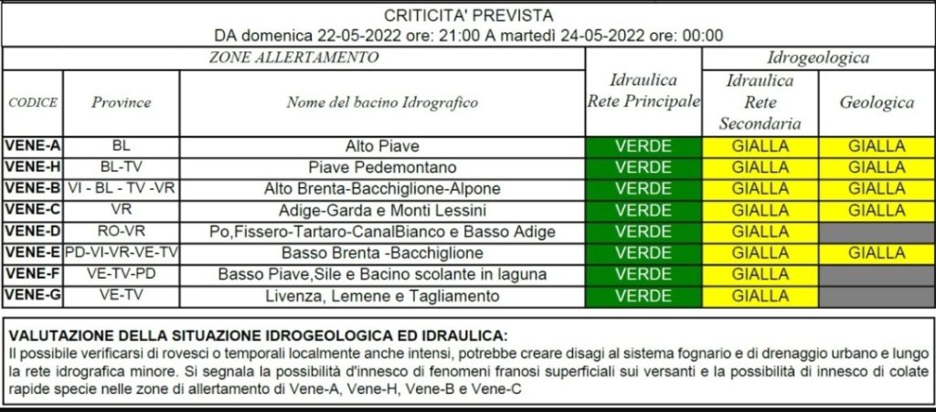 Alla luce delle previsioni meteo, il Centro Funzionale Decentrato della Protezione Civile della Regione Veneto, ha dichiarato lo Stato di Attenzione (allerta gialla) per criticità idrogeologica, valevole dalle ore 21 di oggi alle ore 00 di martedì 24.