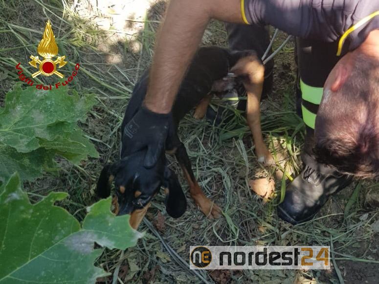“Teo” un piccolo meticcio, oggi pomeriggio era a passeggio ad Arzarello di Piove di Sacco, tutto a un tratto si è messo a correre inoltrandosi nell’erba alta in mezzo a un campo a oltre duecento metri dalla strada, rincorso dalla padrona, la quale, l’ha ritrovato vicino a un cucciolo di segugio impigliato in un vecchio cavo telefonico.
