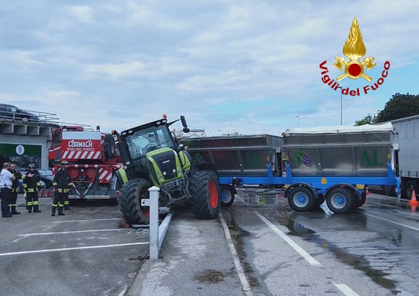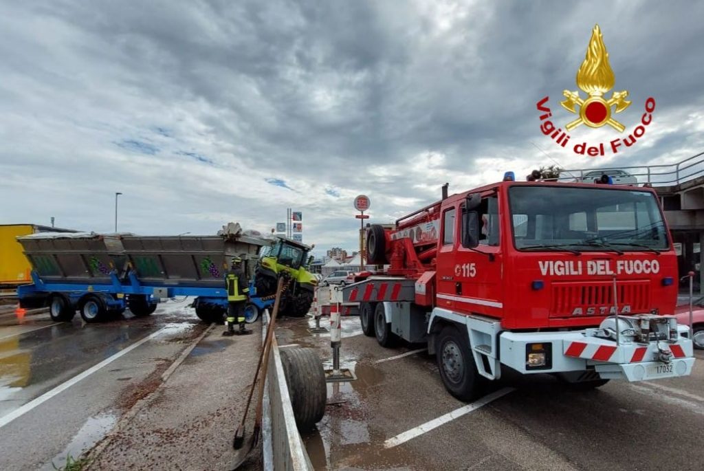 I pompieri infatti provvedevano inizialmente a liberare la sede stradale dal carico d'uva parzialmente fuoriuscito dal rimorchio e poi con il supporto dell'autogru, giunta dalla sede centrale, liberavano il trattore che era bloccato a cavallo di un muretto con una ringhiera incastrata sotto al mezzo e successivamente sollevavano il rimorchio per consentire la sostituzione di una ruota della ralla danneggiata.