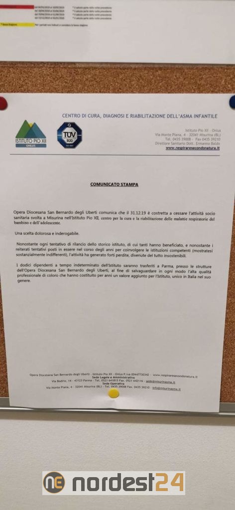 È avvenuto a Misurina (Belluno) all’Istituto Pio XII, gestito dall’Opera diocesana degli Uberti di Parma, che si trova costretto a chiudere perché al riconoscimento della sua qualità sanitaria non è seguito un riconoscimento fatto anche di contributi economici, di invio di pazienti.