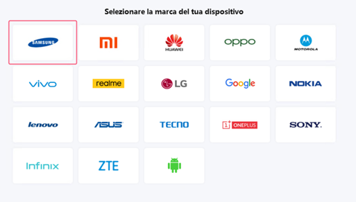 - Seleziona il tuo modello di Android, tra quelli suggeriti. Nel nostro caso un Samsung.