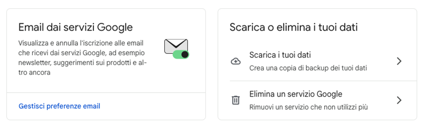 Se desideri cancellare solo uno o alcuni dei servizi associati al tuo account Google (come Gmail o YouTube) senza eliminare tutto l’account, puoi farlo con questi passaggi: