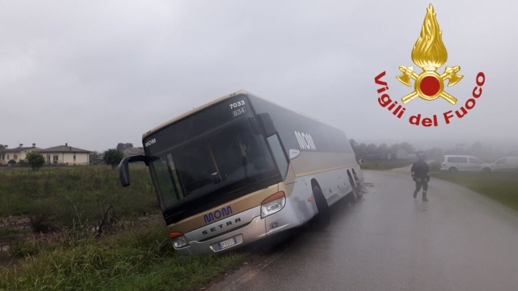 MORIAGO DELLA BATTAGLIA (TREVISO). Alle 9 di martedì, i vigili del fuoco sono intervenuti in via Monte Grappa a Moriago della Battaglia TV) per un pullman finito fuori strada: nessuna persona è rimasta ferita.