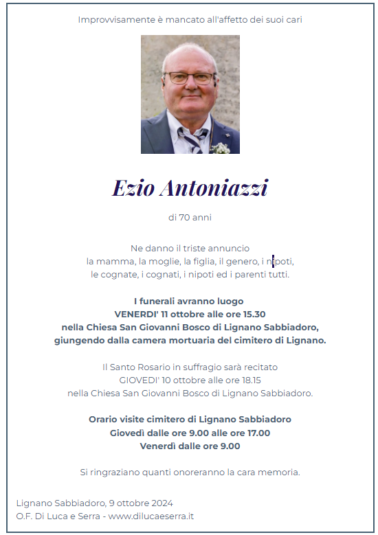 I funerali di Ezio Antoniazzi si terranno venerdì 11 ottobre alle 15:30 presso la chiesa di San Giovanni Bosco a Lignano. Il Santo Rosario in suffragio sarà recitato giovedì 10 ottobre alle ore 18.15 nella stessa chiesa.