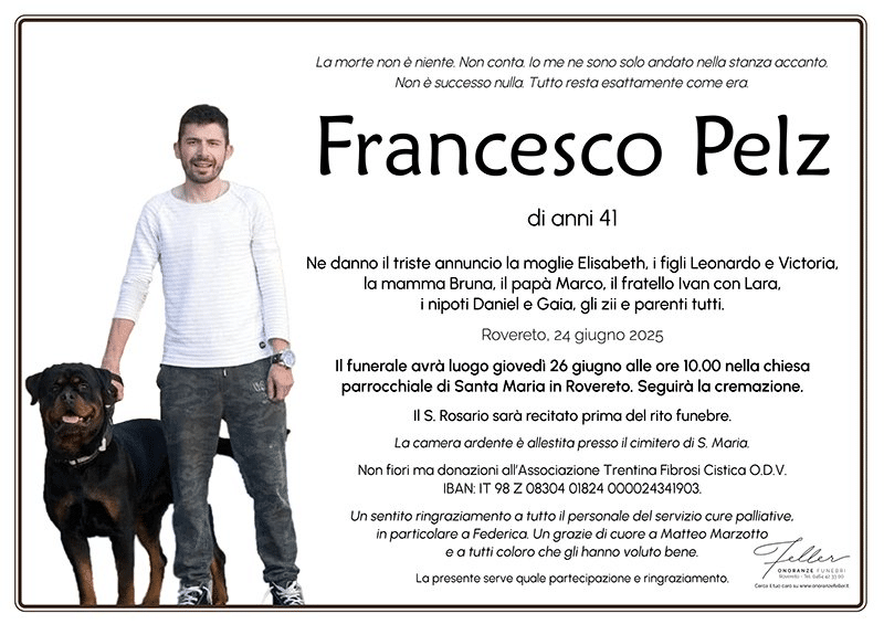 ROVERETO (TRENTO) – Addio a Francesco Pelz, stroncato a 41 anni dalla fibrosi cistica. Una malattia respiratoria rara e aggressiva, con cui ha combattuto fin da bambino, gli ha segnato profondamente l’esistenza. Nonostante tutto, Francesco non si è mai arreso, affrontando cure complesse e, nel 2018, anche un delicato trapianto di polmoni che gli aveva ridato nuove prospettive.