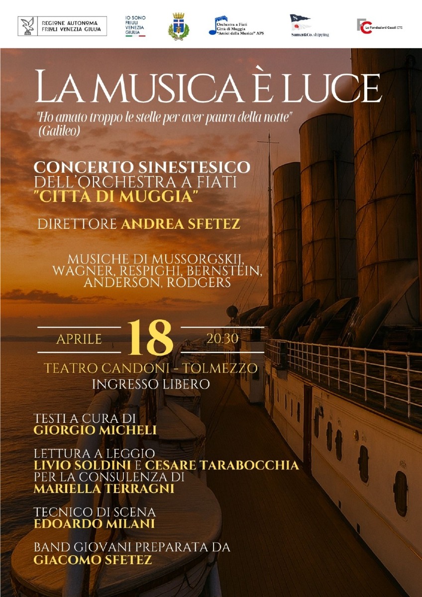 TOLMEZZO (UD) - Approda a Tolmezzo, dopo le date di Udine, Muggia, Trieste, Gorizia, Pordenone e Duino, "La Musica è Luce", progetto musical-teatrale che prevede un ciclo di otto concerti in sette località regionali fino a maggio 2026. Lo spettacolo, a ingresso libero, si terrà domani, sabato 18 aprile alle ore 20.30 al teatro Candoni e gode del patrocinio della Città di Tolmezzo.