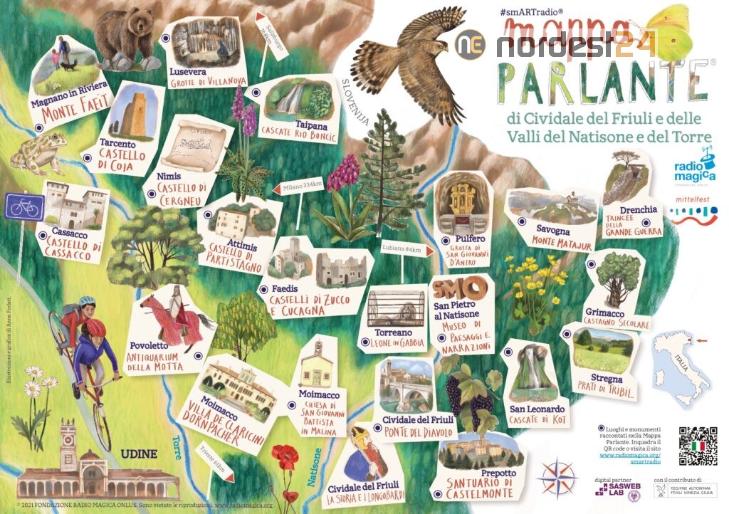 Si tratta di una mappa d’autore, cartacea e digitale, in cui ogni comune del territorio è rappresentato da un luogo o monumento del cuore scelto e votato dai suoi abitanti. Attraverso un QR Code posizionato sulla mappa cartacea o dai siti di Radio Magica e Mittelfest, si potrà accedere alla mappa parlante digitale per ascoltare le audio e video storie realizzate: 6 racconti e 16 curiosità dedicate ai luoghi scelti dalla comunità. Artisti locali e internazionali hanno partecipato alla realizzazione della nuova Mappa Parlante®: Anna Forlati (illustratrice della mappa), Davide Calì e Mariaelena Porzio (autori dei racconti), Paolo Cossi (illustratore), Ornella Serafini, Daniela Gattorno, Adriano Giraldi e Valentino Pagliei (attori), Nicola Marchesin (videomaker).