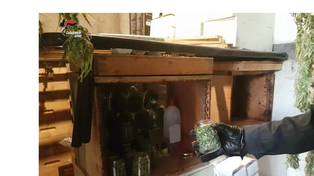 L’uomo, infatti, nel corso di una perquisizione domiciliare eseguita su decreto emesso dalla Procura della Repubblica di Udine, è stato trovato in possesso di complessivi kg. 4,1 di “cannabis indica”, suddivisa in 71 vasetti di vetro del tipo normalmente utilizzato per conservare il miele (il vasellame era tra l’altro custodito all’interno di alcune arnie per apicoltura), nonché di 33 piante di marijuana dell'altezza media di 2 metri e di un bilancino di precisione perfettamente funzionante.