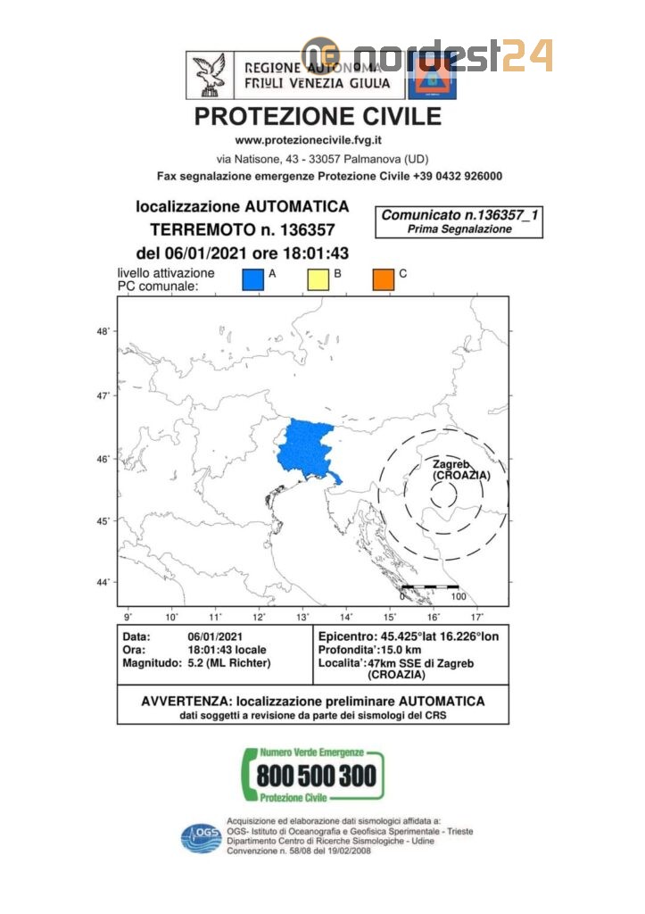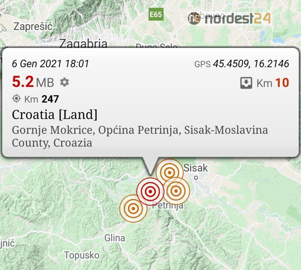 La scossa di oggi mercoledì 6 gennaio 2021 è stata di magnitudo mb 5.2 ed è avvenuto alle ore 18:01 con coordinate geografiche (lat, lon) 45.45, 16.22 ad una profondità di 10 km.