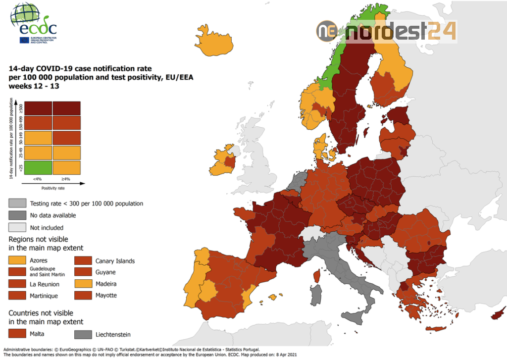 Nessuna zona rossa, rosso scuro o arancione in Italia: tutto il Paese è grigio scuro secondo la nuova mappa Covid Ue aggiornata oggi, giovedì 8 aprile, dall’Ecdc, il Centro europeo per la prevenzione e il controllo delle malattie, che classifica le zone a maggiore o minore rischio Covid.
