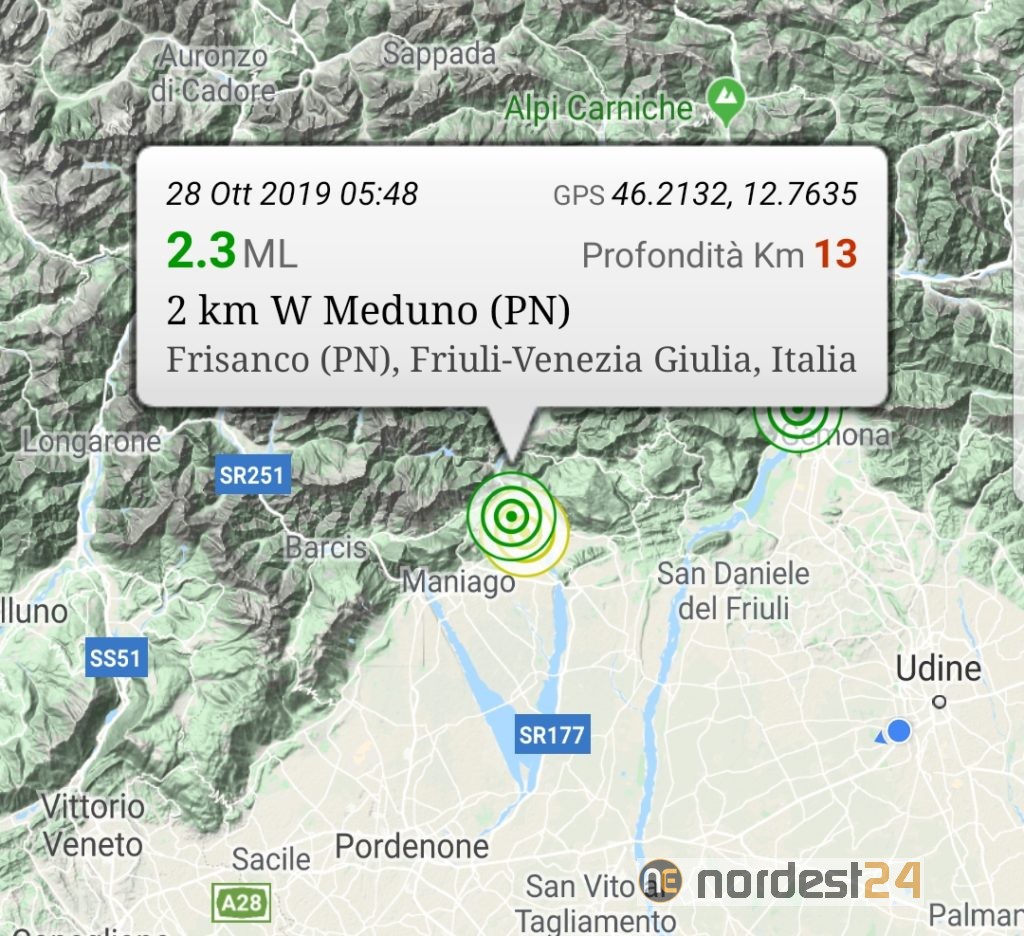 Un terremoto di magnitudo ML 2.3 è avvenuto infatti nella zona a 2 km W Meduno (PN), oggi lunedì 28-10-2019 alle ore 05:48:16 con coordinate geografiche (lat, lon) 46.21, 12.76 ad una profondità di 13 km.