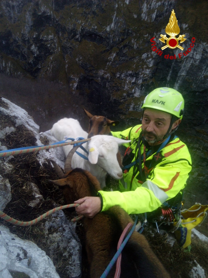 Otto ore di lavoro per strappare alla morte 3 capre bloccate da 5 giorni: l'intervento dei pompieri