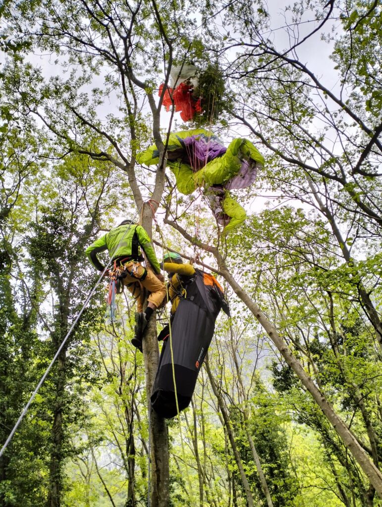 I soccorritori sono riusciti a lanciare una corda su una forcella dell'albero e a risalirla con tecniche d'alpinismo fino a raggiungerlo per sollevarlo in sicurezza e sganciarlo dalla vela. Infine sono riusciti anche a recuperare la vela.