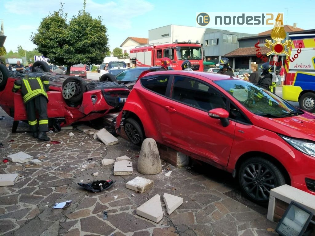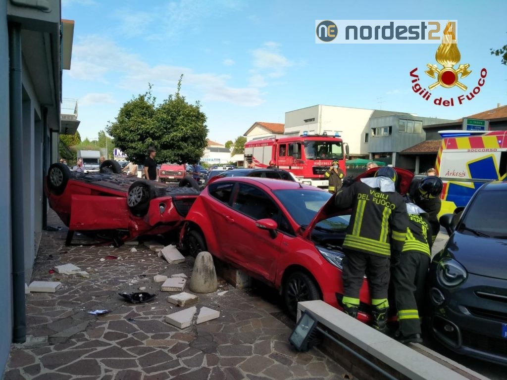 La Prima squadra dei Vigili del Fuoco di Pordenone è intervenuta a Sacile in Viale della Repubblica per un rocambolesco incidente stradale avvenuto poco dopo le 17 che ha visto un'autovettura, finita poi con ruote all'aria, impattare su due auto in sosta e un muretto limitrofo.