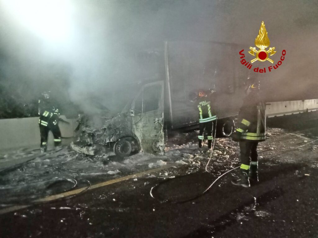 Pauroso incendio in A4, furgone distrutto dalle fiamme
