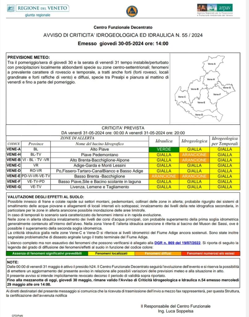 Il Centro Funzionale Decentrato della Protezione Civile del Veneto ha emesso un nuovo avviso di criticità, esteso per le prossime 24 ore, iniziando dalla mezzanotte di oggi fino alle 20:00 di domani, venerdì 31 maggio. Questo aggiornamento segue l’avviso di ieri e aumenta il livello di allerta idrogeologica per temporali a giallo per tutti i bacini idrografici della regione.