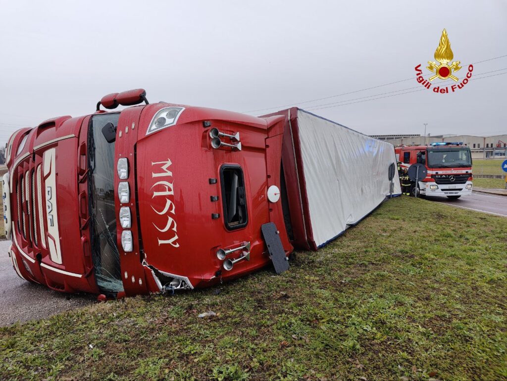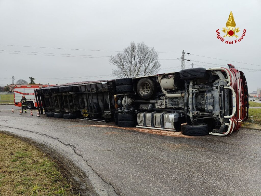 CASTELFRANCO VENETO. Alle 13:40, i vigili del fuoco sono intervenuti in Via per San Floriano lungo la strada per l’immissione alla SR 53 a Castelfranco Veneto per un autoarticolato finito rovesciato: ferito il conducente.