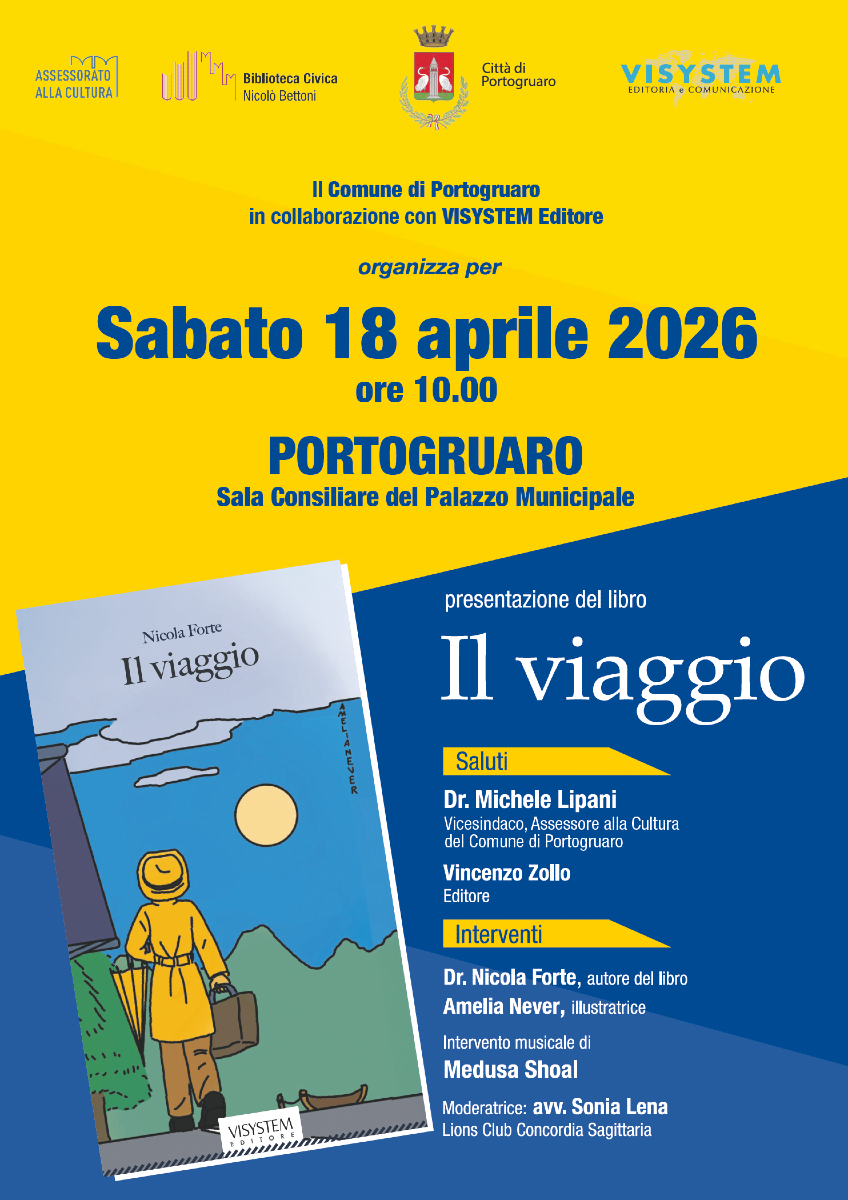 PORTOGRUARO (VE) - Sabato 18 aprile avrà luogo la seconda tappa della presentazione del libro “Il viaggio” del Dr. Nicola Forte. Dopo il grande successo di febbraio per la prima assoluta a Concordia Sagittaria, città dove l’autore opera come medico di base ed è molto ben voluto, il Dott. Forte replica nella sua Portogruaro. L’appuntamento, in programma per le ore 10.00 presso la Sala Consiliare del Palazzo Municipale, è stato organizzato dal Comune di Portogruaro in collaborazione con VISYSTEM Editore. Il programma prevede i saluti istituzionali del Dr. Michele Lipani, collega dell’autore nonché Vicesindaco e Assessore alla Cultura del Comune di Portogruaro, e di Vincenzo Zollo, editore del volume. Dopodiché la parola verrà lasciata al Dr. Nicola Forte e all’illustratrice Amelia Never, che ha animato coi suoi disegni diverse pagine dello scritto, con l'accompagnamento musicale di Medusa Shoal e moderati dall'avvocato Sonia Lena del Lions Club di Concordia Sagittaria.