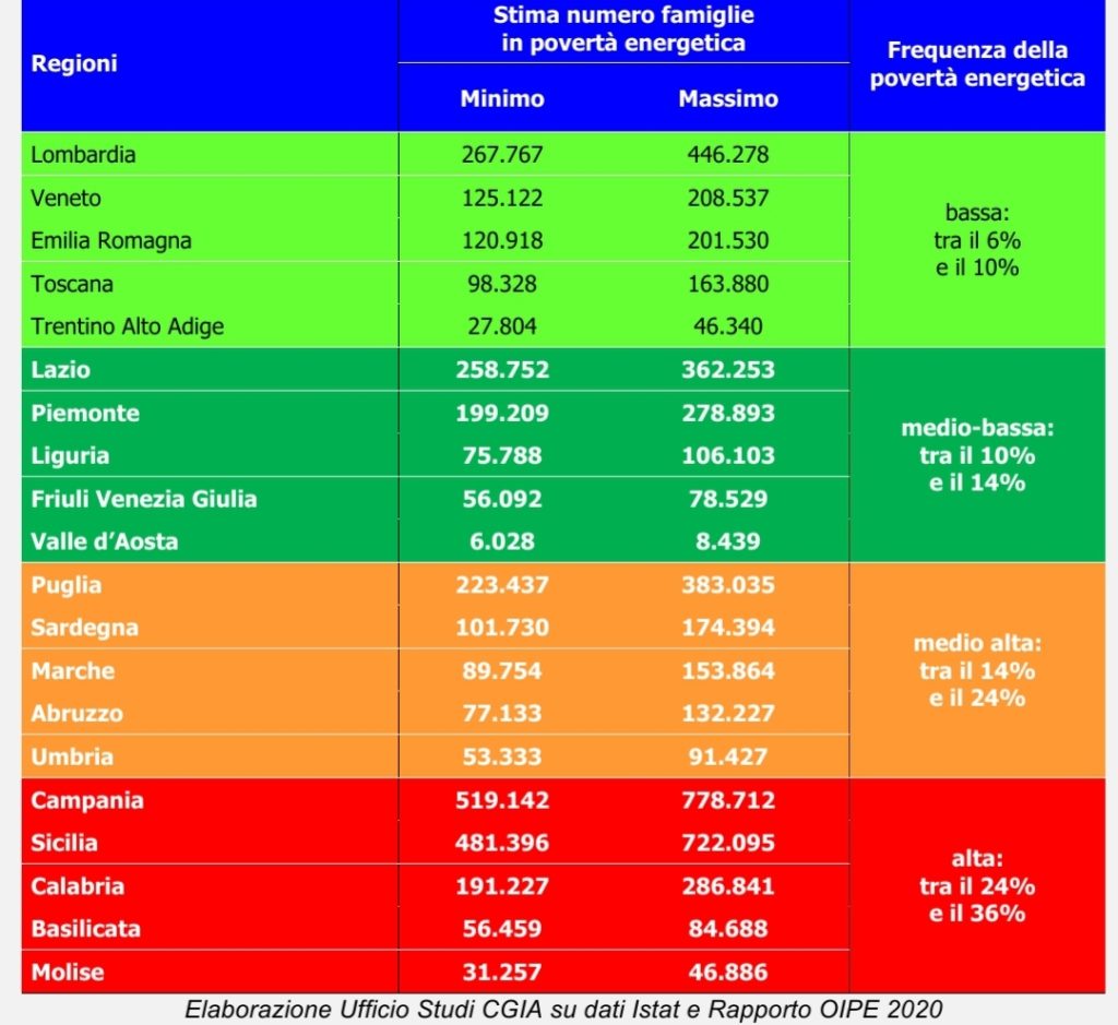 Secondo l’elaborazione dell’Ufficio studi della CGIA sui dati del Rapporto OIPE 2020 , si stima che in Italia ci siano 4 milioni di nuclei in difficoltà (vedi Tab. 1). In Friuli Venezia Giulia (FVG) la frequenza della povertà energetica oscilla tra il 10 e il 14 per cento. Pertanto, rientrano in questa fascia di vulnerabilità un numero minimo di 56.050 fino a un massimo di circa 78.500. Famiglie che si trovano nell’impossibilità di procurarsi un paniere minimo di beni e servizi energetici: come il riscaldamento, il raffrescamento, l’illuminazione, l’utilizzo di elettrodomestici, etc.