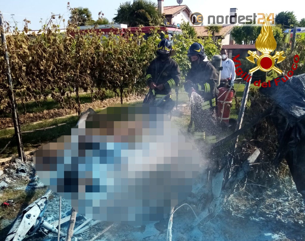 I pompieri arrivati da San Donà e da Mestre con l’elicottero, hanno spento l’incendio del velivolo.