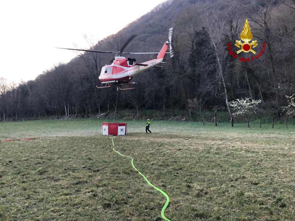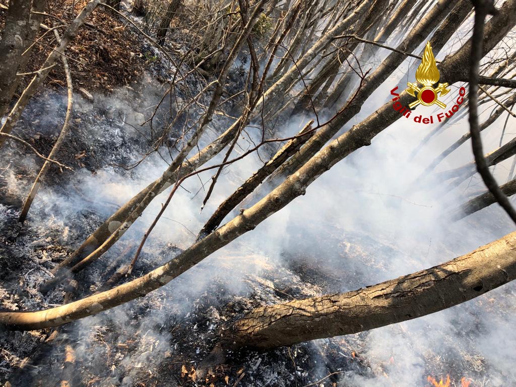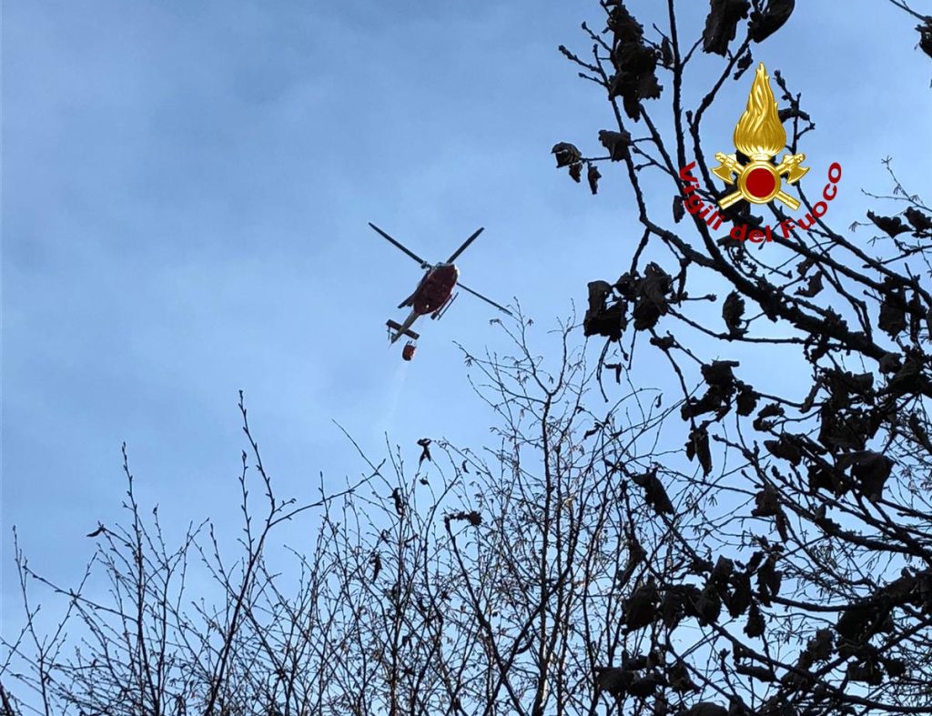 Sono ora in corso le operazioni di spegnimento con lanci effettuati dagli elicotteri e l’intervento da terra con squadre miste dei vigili del fuoco e volontari di protezione civile dell’antincendio boschivo regionale.
