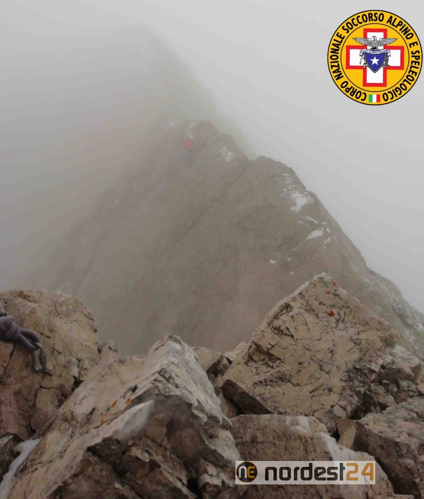 Due dei quattro soccorritori di supporto hanno raggiunto la vetta, altri due attendono nel punto in cui sarà effettuata la calata con la corda per rientrare poi più facilmente al Bivacco Greselin.