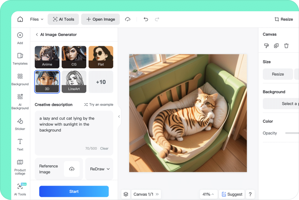 Gli utenti possono generare istantaneamente immagini a partire da un testo grazie a questo strumento di editing fotografico AI, dando vita alla propria immaginazione. È perfetto per tutti: grafici, social media manager, artisti o chiunque voglia modificare le proprie foto. Puoi inserire qualsiasi tipo di descrizione, anche complessa, e il sistema genererà immagini realistiche.